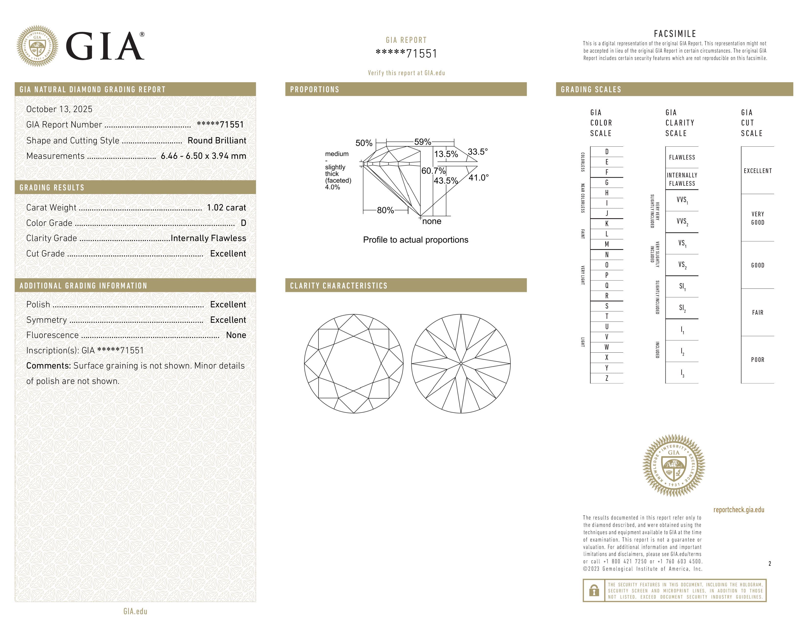 The GIA report documents the diamond’s key characteristics (cut, color, clarity, measurements) based on gemological evaluation.