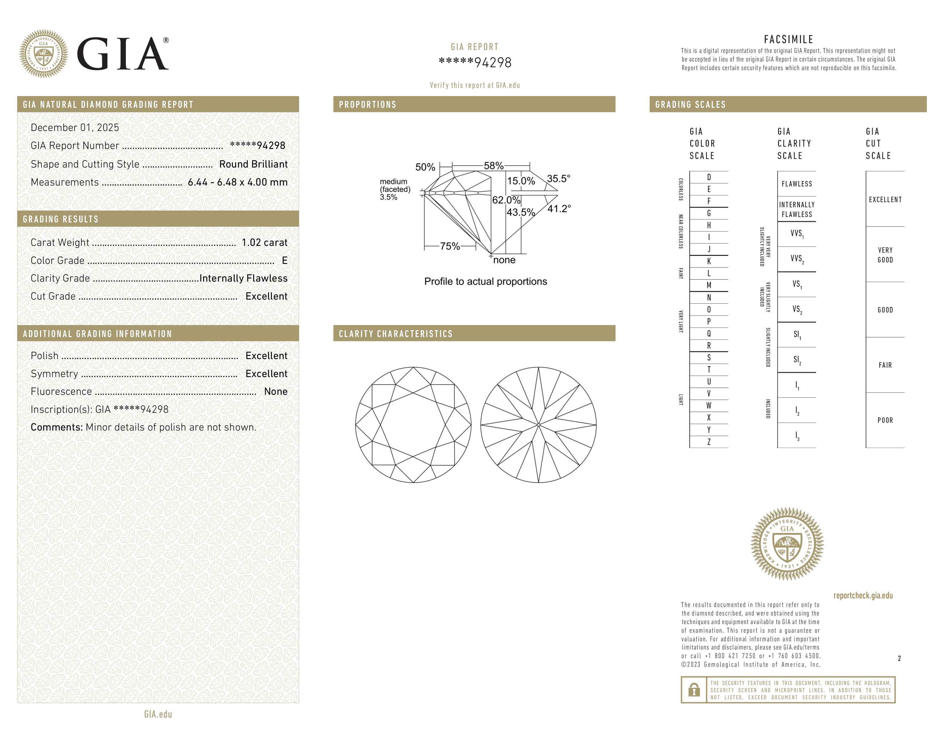 The GIA report documents the diamond’s key characteristics (cut, color, clarity, measurements) based on gemological evaluation.