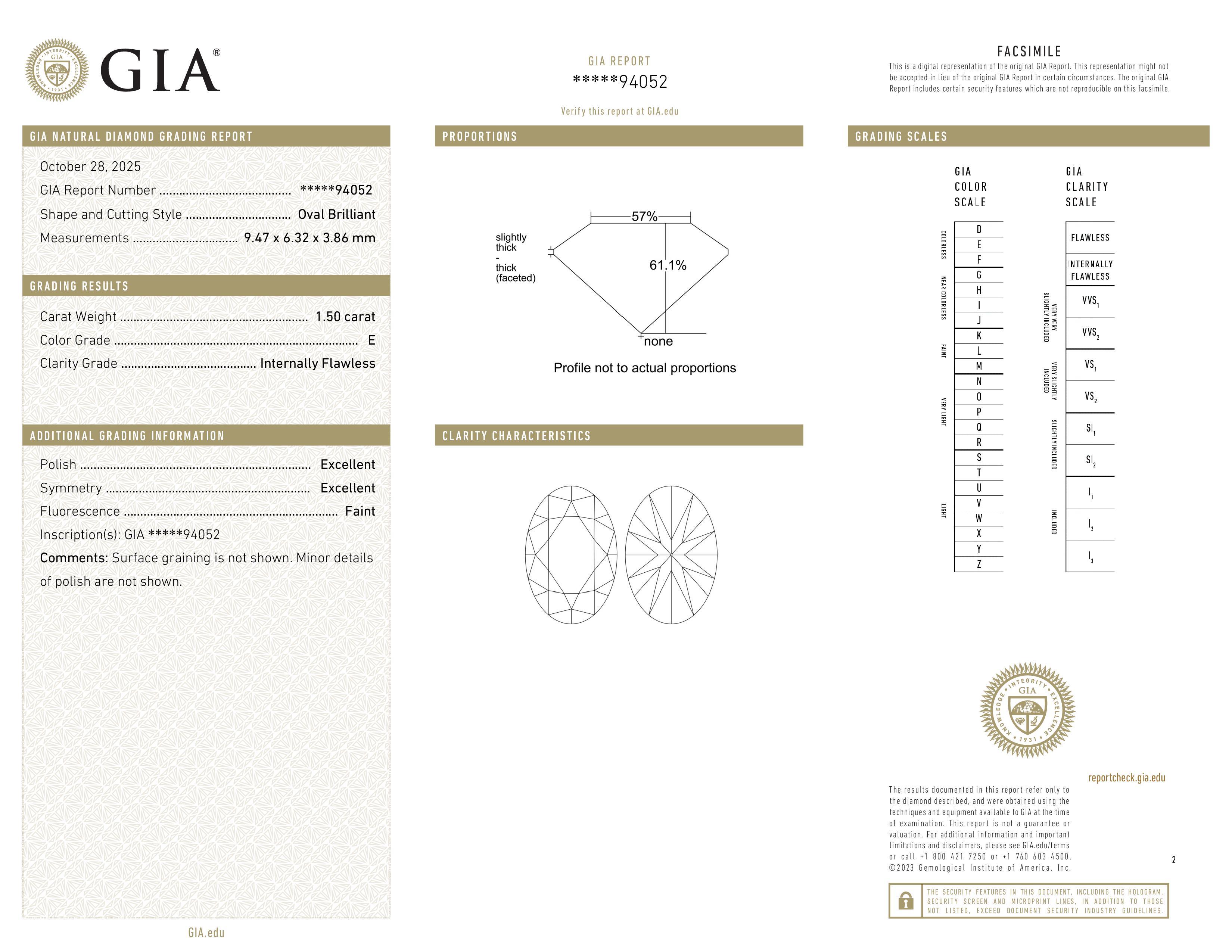 The GIA report documents the diamond’s key characteristics (cut, color, clarity, measurements) based on gemological evaluation.